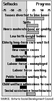 Rob Wright did not need a report to tell him that social conditions in Toronto are deteriorating. The homeless 44-year-old man held his hat out to passersby yesterday as two reports on quality of life were released 10 floors above him, near the corner of Yonge and Carlton Sts. Both reports - one covering all of Ontario, the other focusing on Toronto - concluded that quality of life over-all has improved to near 1990 levels for many people, but that there is a growing ``social deficit'' for people at the lower end of the economic spectrum. ``Of course it's getting worse, there's no affordable houses for anyone,'' said Wright, who said he was put out of work because of an accident on the job three years ago. ``Even if you're working, you can't get a place for minimum wage.'' The studies, one by the Ontario Social Development Council, the other by the Community Social Planning Council of Toronto, support Wright's claims. ``We are committing more and more people to poverty, and it is something we must change if we are to avoid the polarization of our society,'' Peter Clutterbuck, co-director of the Toronto planning council, told a news conference yesterday. The quality of life studies point to a growing `What about me?' sentiment among residents of Ontario and Toronto, with less concern now than 10 years ago for those less fortunate. This will come back to haunt all of society, as children raised in poverty are more likely to have problems later on, Ontario council director Malcolm Shookner said. If poverty isn't addressed, he said, we can likely expect higher drop-out rates, more chance of Children's Aid Society involvement and a greater chance of legal troubles. ``We as a society will have to pay for these long-term effects,'' Shookner said. Across Ontario, growing waiting lists for public housing were the largest negative contributor to the quality of life numbers. And while there are more people working in the province and fewer on social assistance, tighter eligibility rules and more low-wage jobs with no benefits are closely linked to the reduced welfare caseloads, said Shookner, who wrote the provincial study. ``So they went from welfare poverty to working poverty,'' he said. The Ontario council has published quality of life indexes twice a year for the last two years, using 12 indicators to calculate the quality of life for Ontarians since 1990, which was used as a base year. With the recession of the early 1990s, over-all ratings dropped dramatically in 1992, and have only now returned to 1990 levels. However, while economic growth has fuelled this over-all rise, social indicators still show a 21 per cent decline from 1990 ratings. The province did well in areas such as environmental measurements. Eastern Ontario was found to have a higher quality of life rating than the rest of the province.