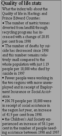 The index also provides a tool to measure human and social development comparative to other areas. The CDC expects to release part two of its report later this spring comparing Quinte's quality of life index with other Ontario Communities. The index was created by the CDC, the Ontario Social Development Council, the Social Planning Network of Ontario, the Centre for Health Promotions at the University of Toronto and the Ontario Healthy Communities Coalition.