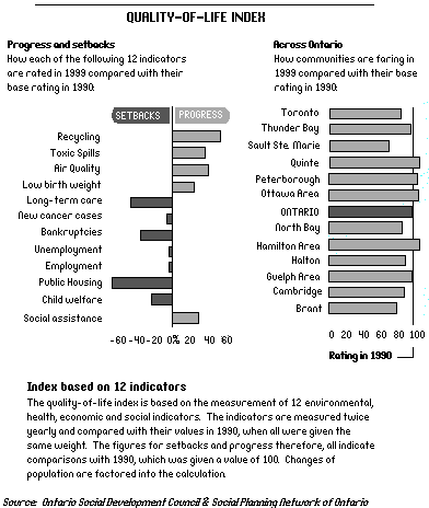 The quality of life in Ontario has bounced back to the level of pre-recession 1990, but the recovery has come at the expense of the poor and the elderly - strikingly so in Toronto. The analysis comes from the Ontario Social Development Council, which twice yearly takes a comprehensive measure of 12 factors to determine the economic, social and environmental health of the province. "This apparent good news about the improvement of the quality of our life also has an undercurrent to it that's somewhat disturbing. We have shown a social deficit…that underlies the general sense of quality of life," said Malcolm Shookner, the council's executive director. Toronto, badly hit by the recession of the early 1990s, has not rebounded and was among the bottom of the communities studied. A doubling of the numbers of people on social assistance over the decade and lengthy waiting lists for social housing dragged the city's rating down. "Because Toronto is such a magnet for so many people, we have more prosperity, and we have more poverty. The disparities in our society are most evident in Toronto, and that's why it drags down their overall rating of quality-of-life index," Mr. Shookner said.
