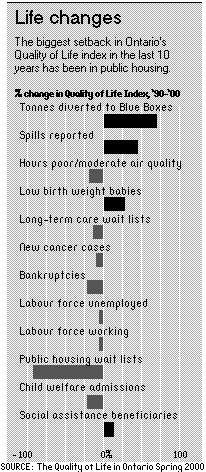 The Quality of Life Index, compiled with help from more than 20 social agencies and councils across the province, rose to 97.7 this spring - up slightly from 96.9 last fall, according to the Spring 2000 report. But the index still hasn't reached the benchmark of 100 set in 1990, just before the recession in the early years of the decade. Shookner noted. On the bright side, economic news - while slightly worse than last fall - continues to improve. Bankruptcies are still dropping from a peak two years ago, says the sixth report jointly published by the council and the Social Planning Net work of Ontario. Although the number of people with jobs tell from a peak reached last October. it increased again in April. And the number of unemployed levelled off in the first three months of this year. However, jobs are barely keeping up with population growth, Shookner said.